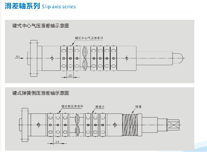 1.鍵式滑差軸以機械凸鍵來夾住管芯,本身是以氣壓方式給氣,隨著內(nèi)部張力高低,進而推動每一扭力機組向外擴張,再依據(jù)充氣壓力大小,來設(shè)定每一扭力組之滑轉(zhuǎn)扭力值,便于調(diào)節(jié)分條線上,每卷物料卷起時之張力,使每一個滑差環(huán)均能解決因物料厚薄及拉力不均所產(chǎn)生脫卷,松緊不一,端面不整齊的現(xiàn)象,使之能平均卷取。
